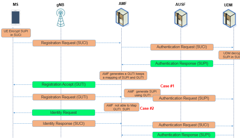 - 当 UE 尝试首次注册时,UE 将 SUPI 加密为 SUCI 并发送 SUCI 请求的初始注册。