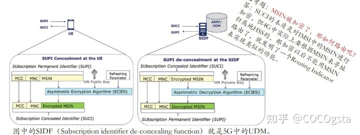 UE用预置的公钥对SUPI进行加密得到SUCI,SUCI通过gNB->AMF->AUSF最后传递给UDM,UDM用私钥进行解密,得到SUPI。如下图所示: