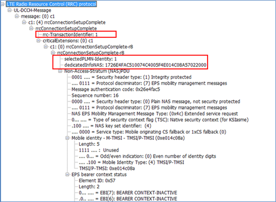 - rrc_TransactionIdentifier:RRC Connection Setup Complete消息中含有rrc_TransactionIdentifier的值应该与RRC Connection Setup中的rrc_TransactionIdentifier相同,信元含义见RRC Connection Setup。