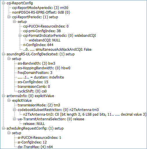 RRC Connection Reconfiguration还包含各个信道的配置信息,如PDSCH、PUSCH、PHICH、PUCCH、上行功率控制信息,以及小区通道数配置信息。