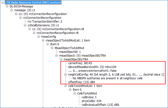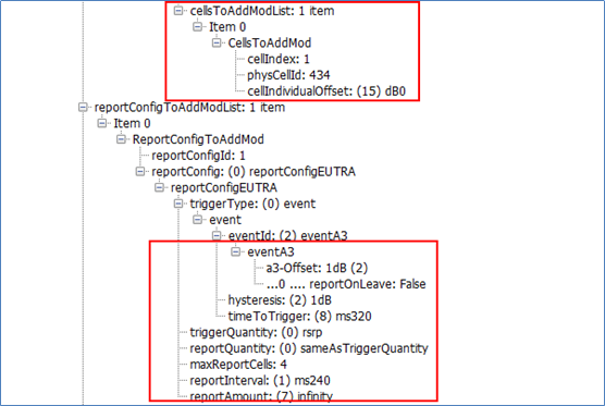 上图所示,RRC Connection Reconfiguration还包含邻区列表信息,包括所有邻区的小区编号Cell ID、PCI、Q_Offset等信息。