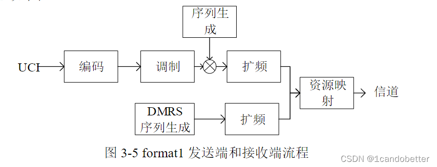 | format1 更好的适应信道,使其能在信道状态较差的信道中传输,与format0 相比,在发送信号中加入了解调参考信号,并且在发送过程中增加了调制的过程。具有最强的码分复用能力。其码分复用能力是从两个不同维度实现的,这两个维度为每个OFDM符号上承载的序列的不同循环移位以及不同OFDM符号上使用的正交扩频码。 |