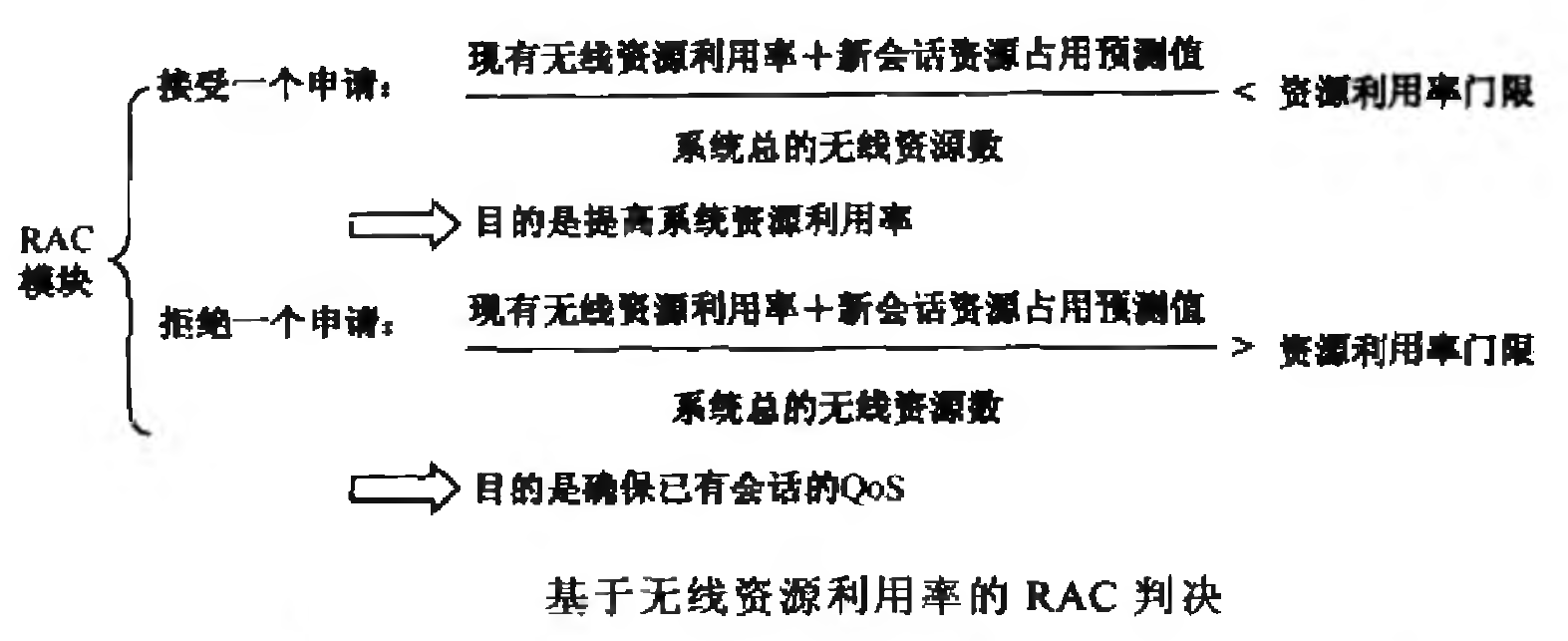 RAC功能的目标就是尽量提髙无线资源的利用率,同时保证己有会话的业务质量(QoS)。只要有可用的、能够满足申请要求的无线资源,就要接纳新RB的建立申请,以提髙无线资源的利用效率;假若新申请建立的RB的QoS无法保证,或者没有可用无线资源,则拒绝RB建立申请,以尽可能确保已有会话的QoS。