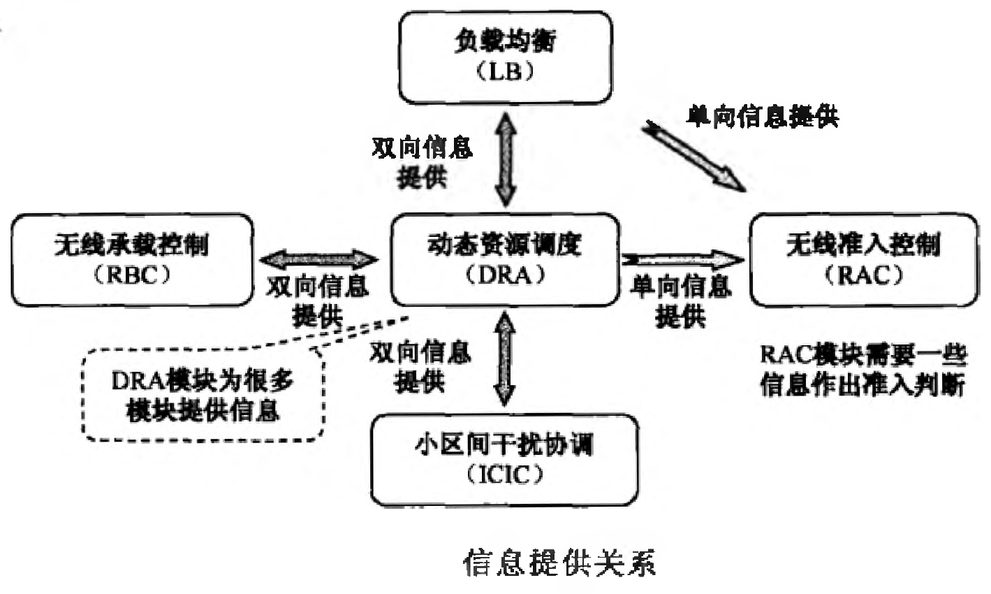 单向信息提供关系:无线准入控制(RAC)根据负载均衡(LB)模块为其提供的负载信息,以及动态资源调度分配(DRA)和为其提供的剩余可分配的资源信息来判断是否允许接入某一业务请求。