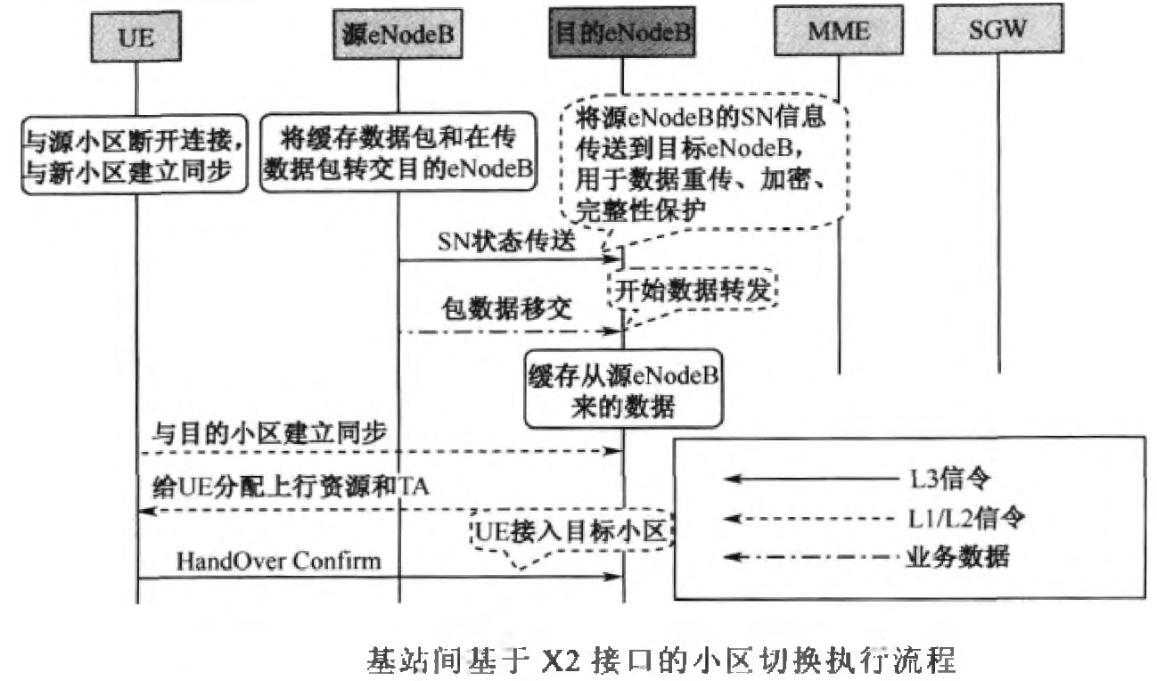 在切换执行过程中,主要完成UE与源小区断开业务连接,与目的小区建立业务连接。在切换执行过程中,也需要源小区将缓冲数据、数据的系统顺序号(SN)转发给目的小区。