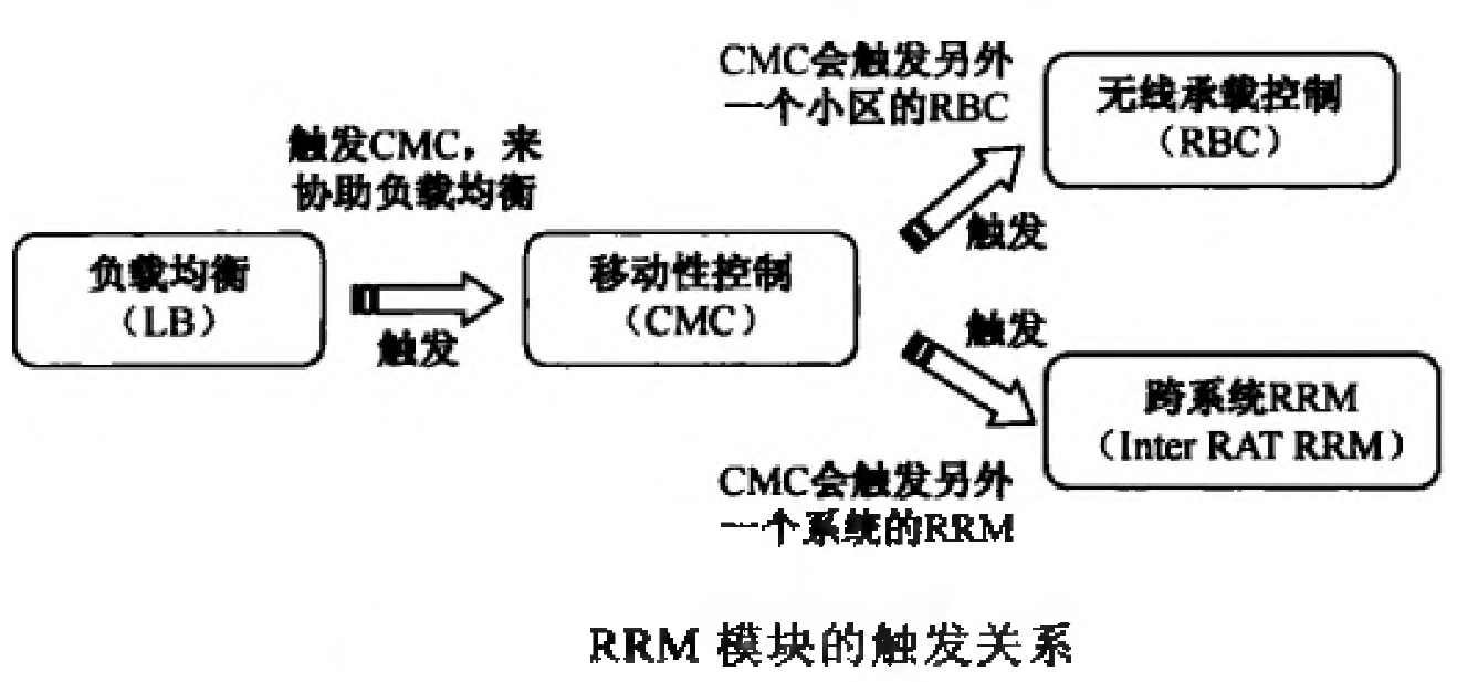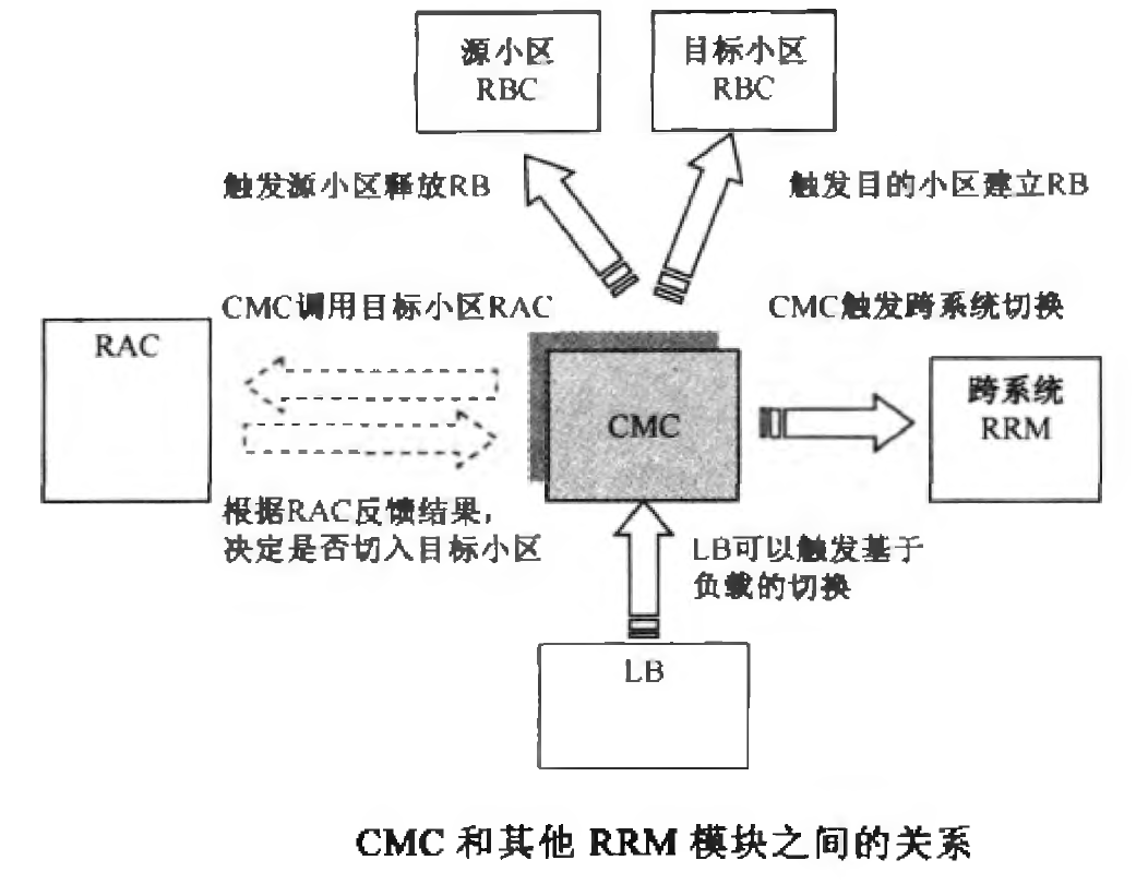 LB模块可以触发基于负载的切换,CMC又需要调用RAC决定是否切入目标小区;当允许切入目标小医的时候,需要触发源小区的RB释放过程和目标小区的RB建立过程。当需要切换到异系统的时候,又会触发跨系统的RRM。