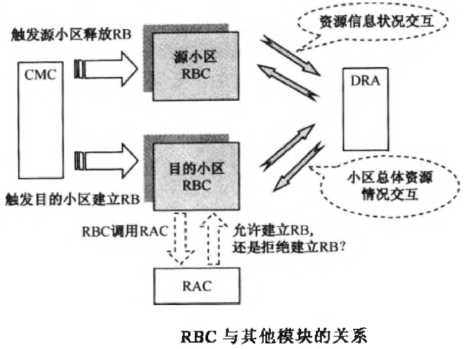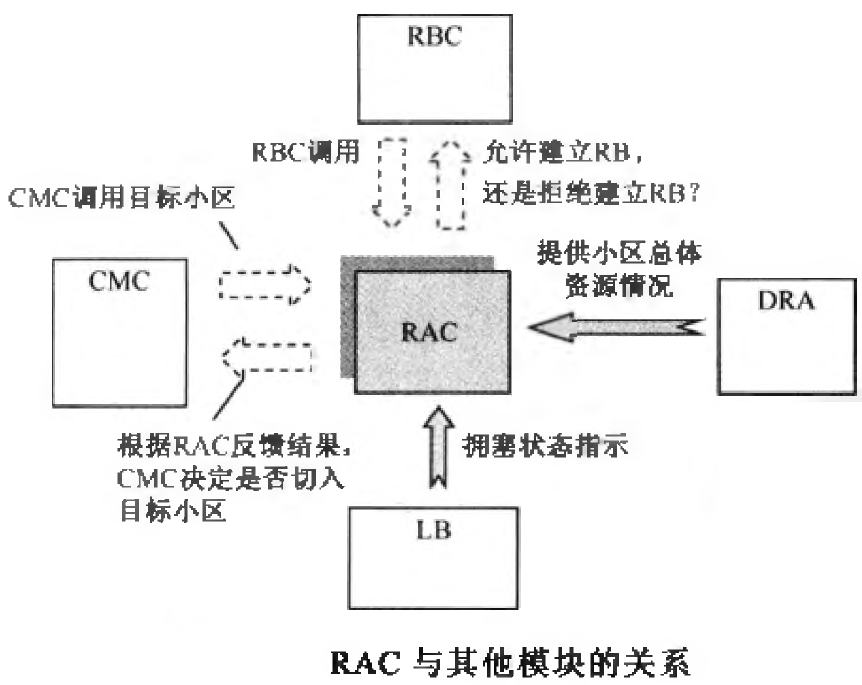DRA模块、LB模块都可以给RAC输入资源利用的一些信息;而RAC的输出又可以指导RBC是否建立RB,或者指导CMC是否切入该小区。