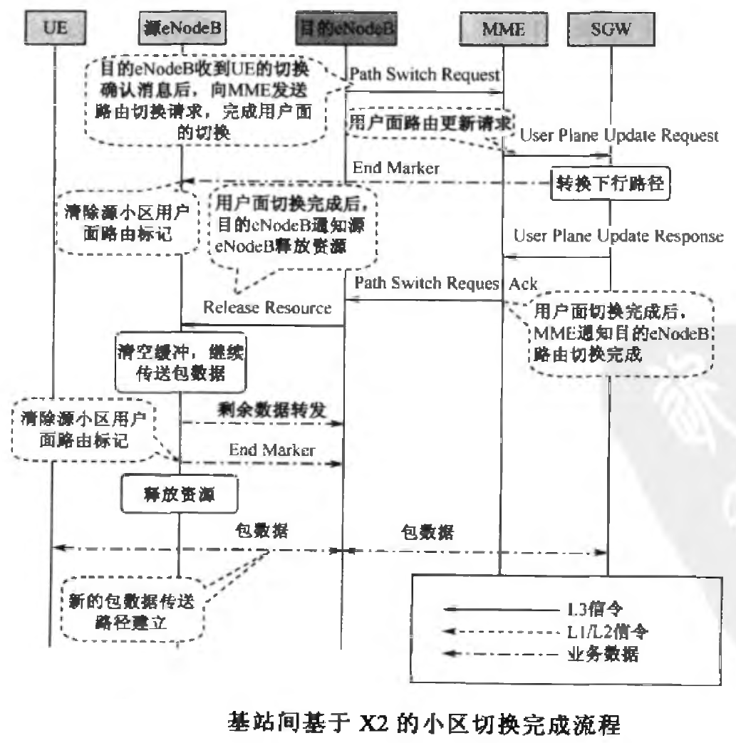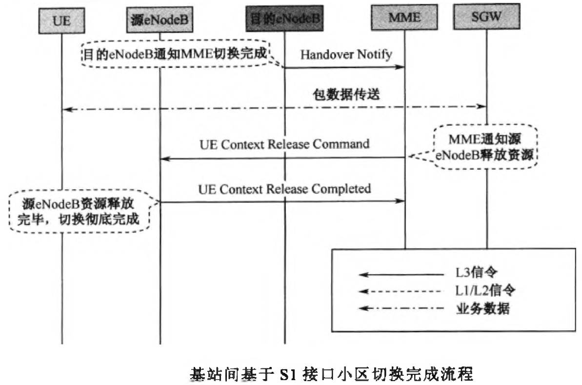 在切换完成阶段,主要完成目标小区与SGW用户平面的切换以及源小区无线资源的彻底释放。
