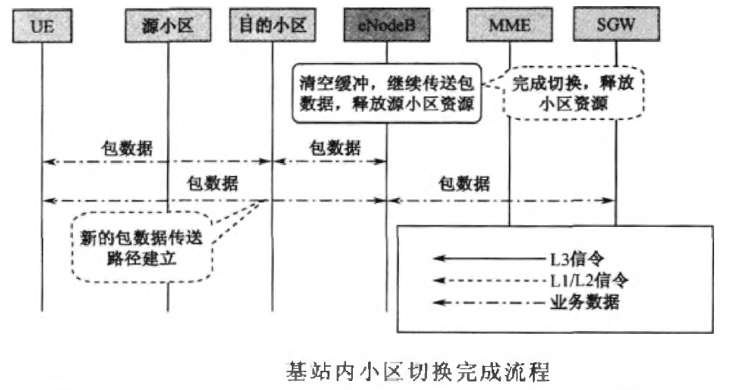 在基站内的两个小区间的切换完成阶段,SGW与eNodeB的路由不变,没有用户平面的切换过程。