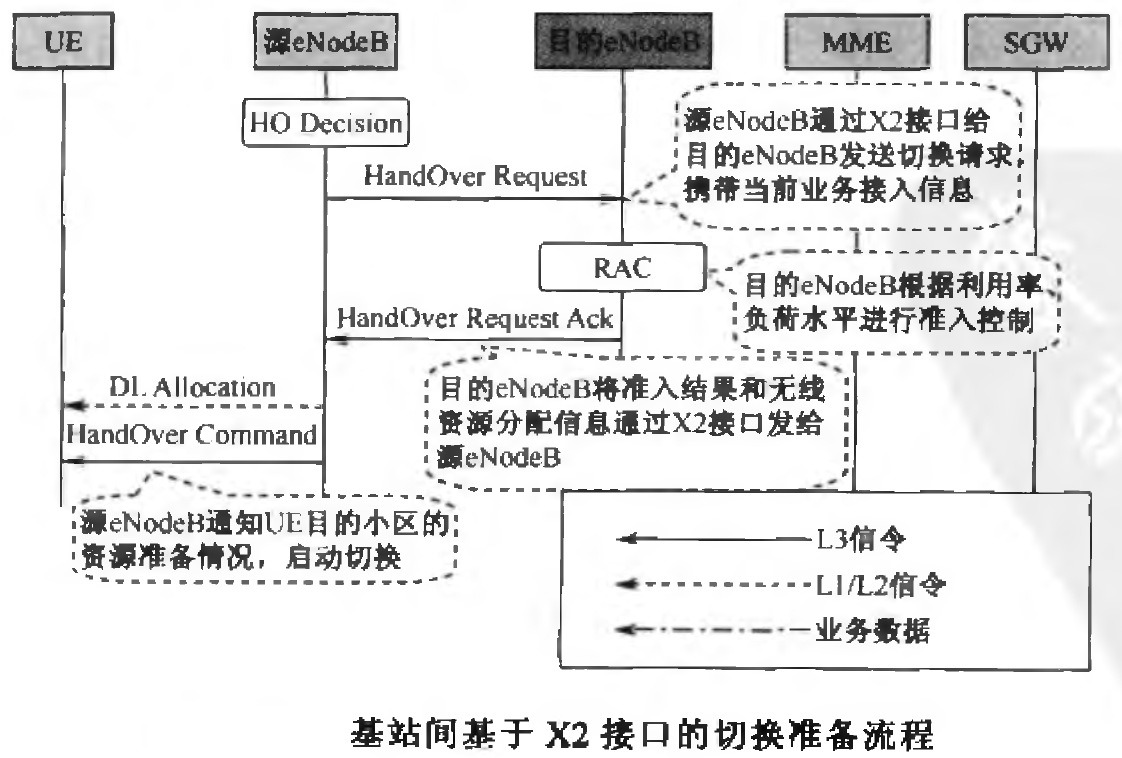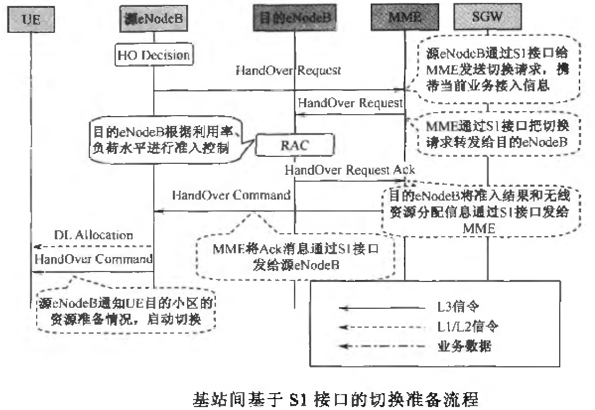 在切换准备过程中,源小区向目的小区申请切换,告知业务信息;目的小区所在的基站进行准入控制(RAC),将准入控制结果告知源小区,源小区通知UE切换。