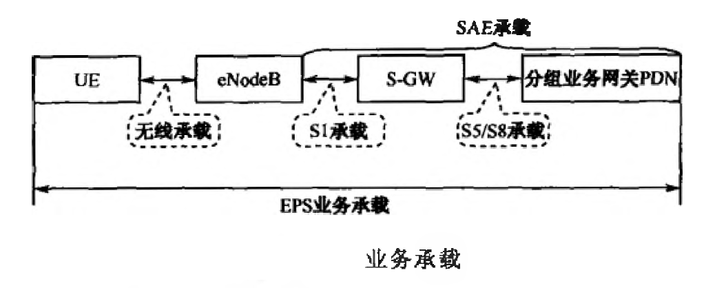 一个用户使用某一业务,涉及从UE到eNodeB;再从eNodeB到SGW,最后到PDN(PGW,分组网关)的业务承载过程。整个EPS业务承载包括无线承载(RB)、S1承载、S5/S8承载。