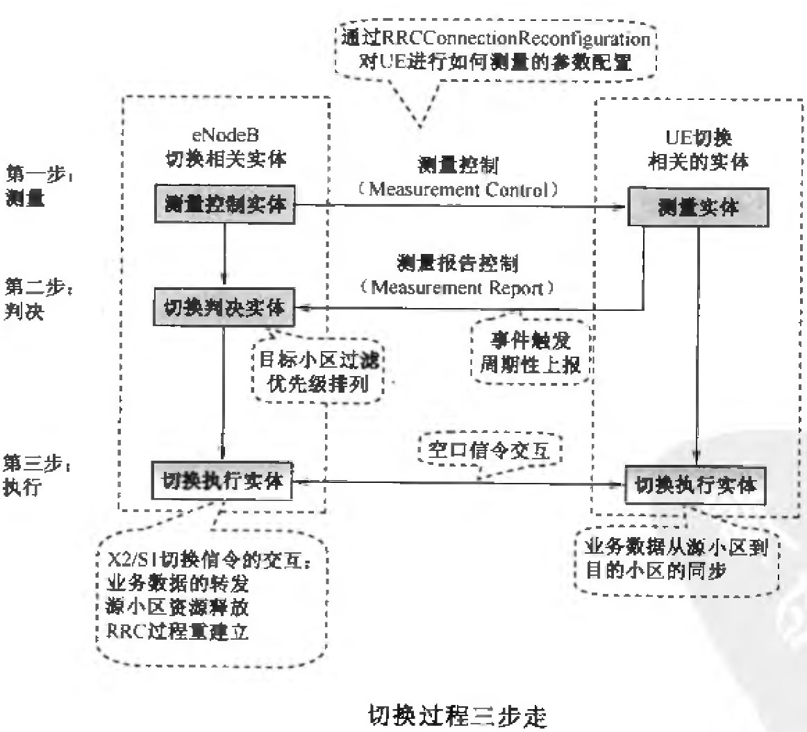 切换的执行是在eNodeB控制下,eNodeB和UE共同完成业务数据转发路径,由源小区到目的小区的变更;eNodeB完成相应接口 X2/S1信令的交互;切换成功后,要完成源小区的资源释放。切换失败,UE要重新选择小区,重新建立RRC链接。