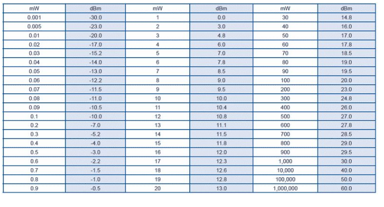 - 0.001mw => -30dBm