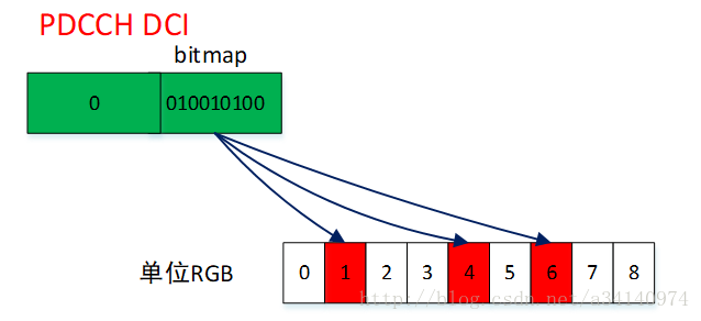 Type 0,Type1对应的DCI有一个字段Resouce allocation header指明使用的是Type 0还是Type 1(需要注意的一点是,如果下行带宽小于等于10 PRBs时,此字段是不存在的,默认使用的是Type 0)。除此之外还有一个长度为的bitmap字段指明某UE PDSCH所用的RBG。Bitmap中的每一位都对应一个RBG,如果某位是1则表示该RBG被分配给这个UE。Bitmap与RBG的对应方式为高位对应低编号RBG。UE解码Type 0 PDSCH的过程如下图所示。