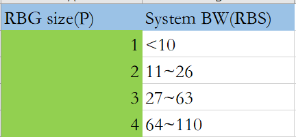 type 0和Type 1的资源分配是基于RBG(Resource Block Group)机制实现的。RBG是一组连续的集中式 VRB(localized VRB)。即每个 RBG 中包含的 VRB 数P可以通过查询下表得出。