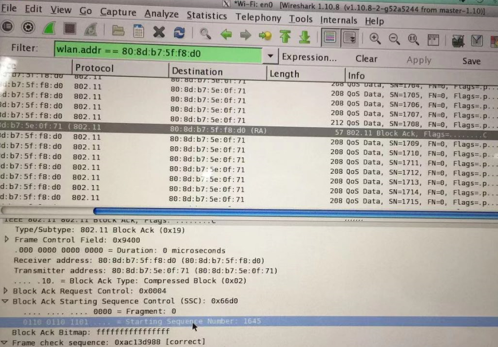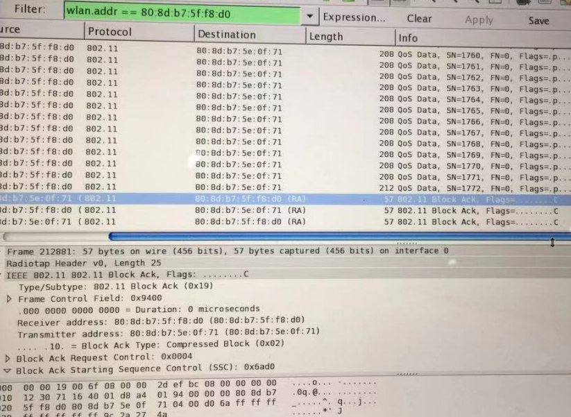如下图这是从空口抓到的一组A-MPDU数据,首先是一个block-ack 帧,注意这个block-ack帧的start-sequence-Number值是1645,十六进制是66d0,接下来是一组MPDU的数据包