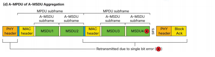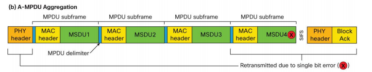 A-MPDU技术是指的按照802.11协议封装后的若干个A_MPDUSubframe报文的聚合。通 过一次性发送若干个MPDU,减少了发送每个802.11报文所需的PLCPPreamble、 PLCPHeader,从而提高系统吞吐量,见下图: