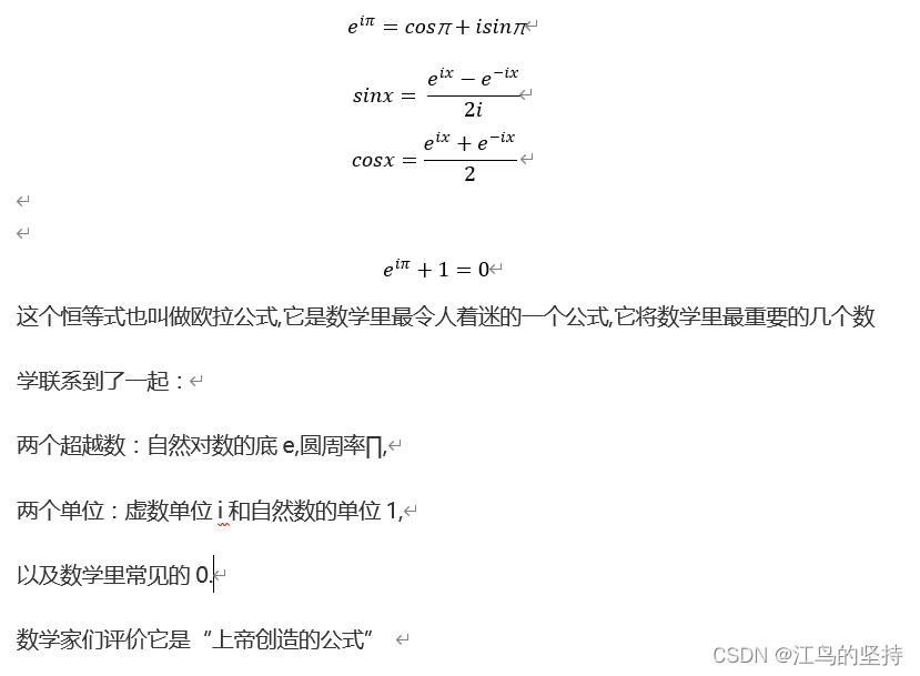 这个恒等式也叫做欧拉公式,它是数学里最令人着迷的一个公式,它将数学里最重要的几个数学联系到了一起:两个超越数:自然对数的底e,圆周率∏,两个单位:虚数单位i和自然数的单位1,以及数学里常见的0.数学家们评价它是“上帝创造的公式”,我们只能看它而不能理解它.