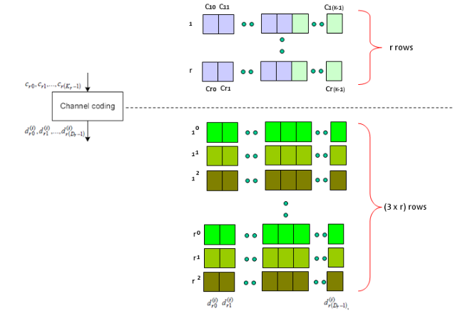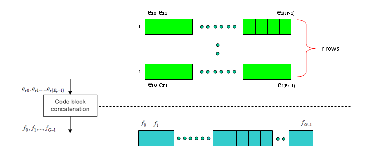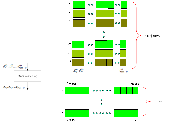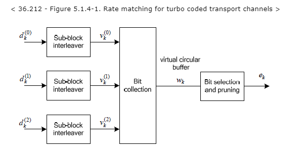 下图是36.212中的另一张图,可以看到Turbo编码输出的三行进入这个速率匹配块,并作为一行比特流输出。