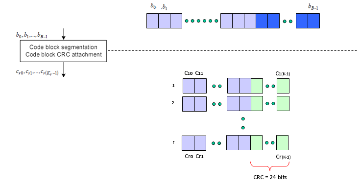 第二步如下。它将大传输块分割成多个小块,并向每个分割块添加另一个CRC。只有当输入块非常大时,即超过6144bit时,才会继续拆分输入块。(见36.212的5.1.2 Code block segmentation and code block CRC attachment)。