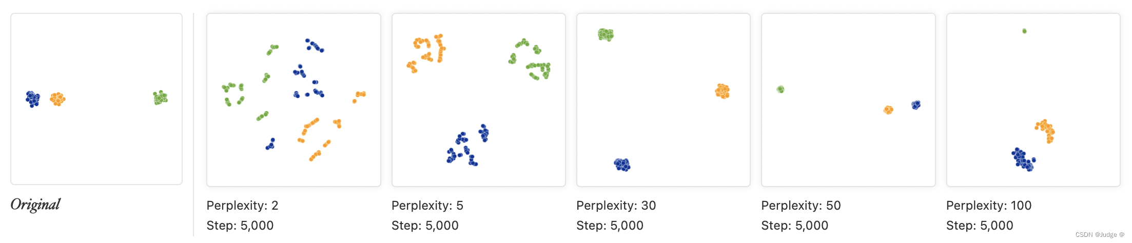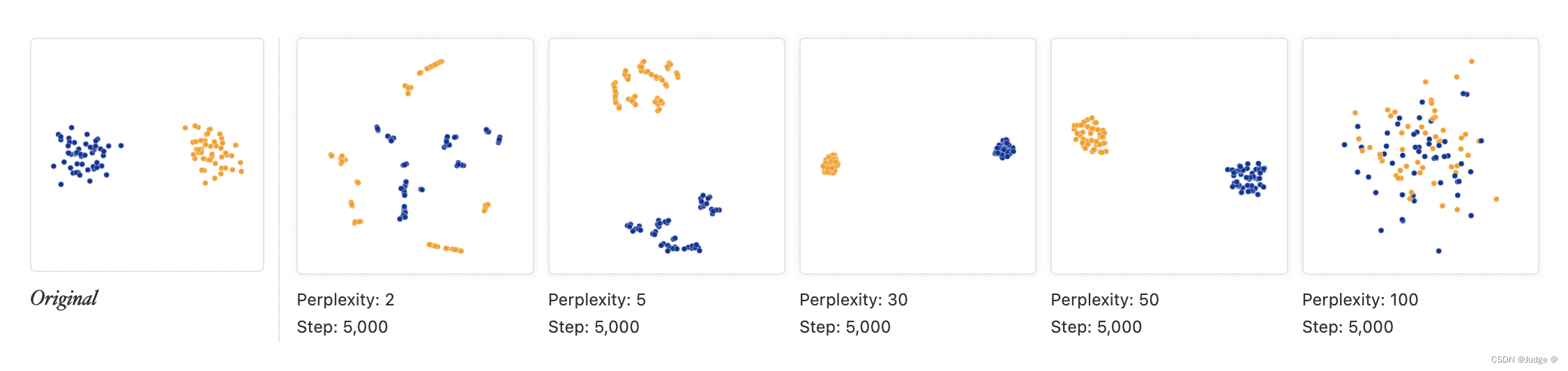 'perplexity' 是一个可调整的全局参数,也是我认为最关键的参数,它可以粗略地表示数据在局部 (local) 和整体 (global) 方面平衡注意力。从意义上来讲的话,它描述了一种猜测,每个点周围有几个近距离的近邻点(close neighbors) 。 一般情况下,会选择 5-50 作为perplexity的值,但有时需要更大的值。
