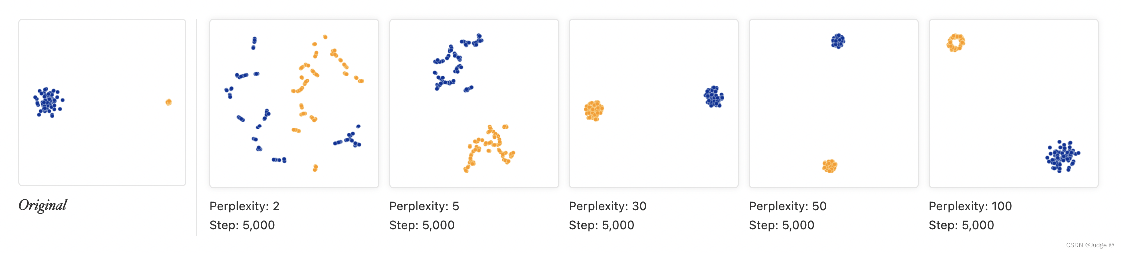 上图表示了在两个类的情况下,数据被表示在2-D平面的例子。可以看到在 perplexity = 2 时,局部变化占主导地位,而 perplexity = 100 时,很难看出什么结果。在5,30,50的情况下,可以看到图像清晰表示出了两个不同的类。