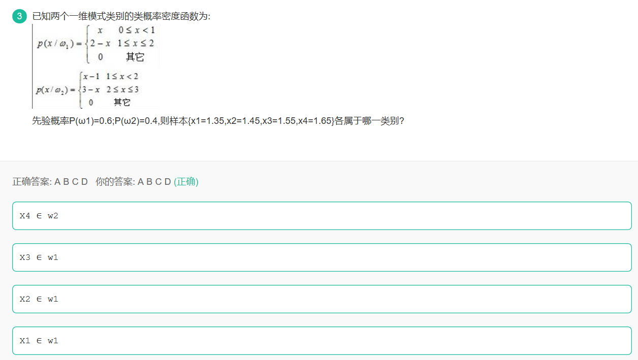 p(w1 | xi) = p(xiw1) / p(xi) = p(xi | w1) * p(w1) / p(xi) = 0.6*(2 - xi) / p(xi) // 因为xi都在 (1,2)范围