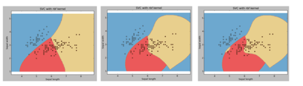 7、假设,我们正在 SVM 算法中为 C(惩罚参数)的不同值进行视觉化绘图。由于某些原因,我们忘记了使用视觉化标注 C 值。这个时候,下面的哪个选项在 rbf 内核的情况下最好地解释了下图(1、2、3 从左到右,图 1 的 C 值 是 C 1,图 2 的 C 值 是 C 2,图 3 的 C 值 是 C 3)中的 C 值。