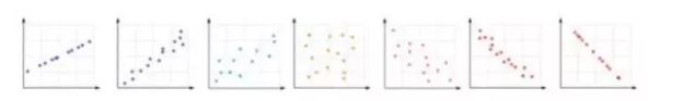 9、有以下 7 副散点图(从左到右分别编号为 1-7),你需要比较每个散点图的变量之间的皮尔逊相关系数。下面正确的比较顺序是?