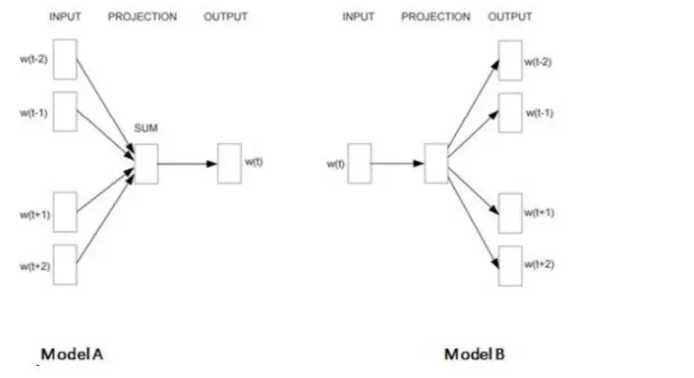 解析:这两个模型都是在 Word2vec 算法中所使用的。模型 A 代表着 CBOW,模型 B 代表着 Skip gram。