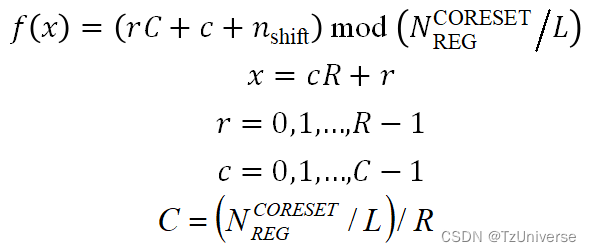 其中,R∈{2, 3, 6},且C必须是整数,即R·C是REG Bundle的个数。(个人看法:x是映射顺序,f(x)是交织后的Bundle索引,即交织后的REG Bundle f(x)按对应的x的顺序,依次映射到每个CCE。)