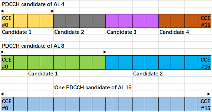构成一个PDCCH candidate的CCE个数称之为Aggregation Level(AL), NR PDCCH可用的AL是1, 2, 4, 8, 16,具体多少个CCE由DCI Payload Size和所需要的编码速率来决定.