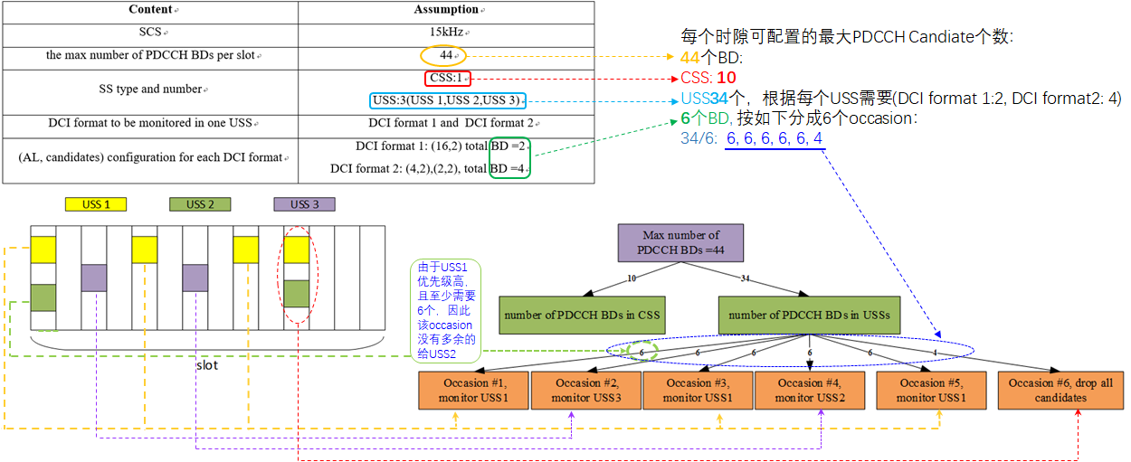 SS set类型 (CSS set或USS set), DCI format(s), monitoring occasion, 每个AL下PDCCH candidates的个数.