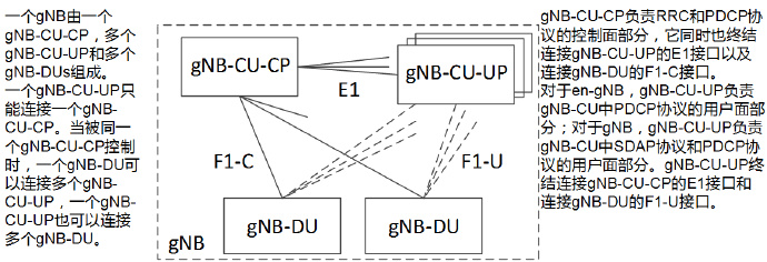 gNB可以拆分为中央单元(gNB-CU)和一个或多个分布式单元(gNB-DUs)