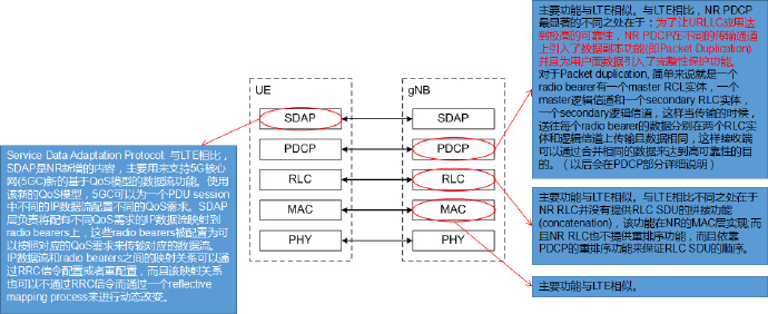 - 流控制功能:该功能容许控制下行用户数据向gNB-DU传输,同时引入多个功能来提升数据传输的性能,比如由于radio link outage造成的PDCP PDUs丢失的快速重传,冗余PDU的丢弃,重传数据指示(retransmitted data indication)和状态报告。