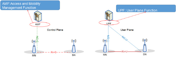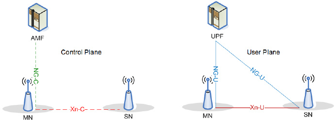 在独立组网方式中,gNB与5G核心网(5GC)相连接;而在非独立组网方式中, NR和LTE紧密整合并连接到现有的4G核心网(EPC), 终端通过双连接(DC, Dual-Connectivity)与NR和LTE基站交互。