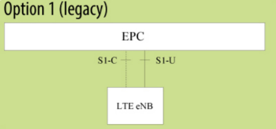 Legacy组网方式: eNB通过S1-C(控制面)和S1-U(用户面)连接EPC
