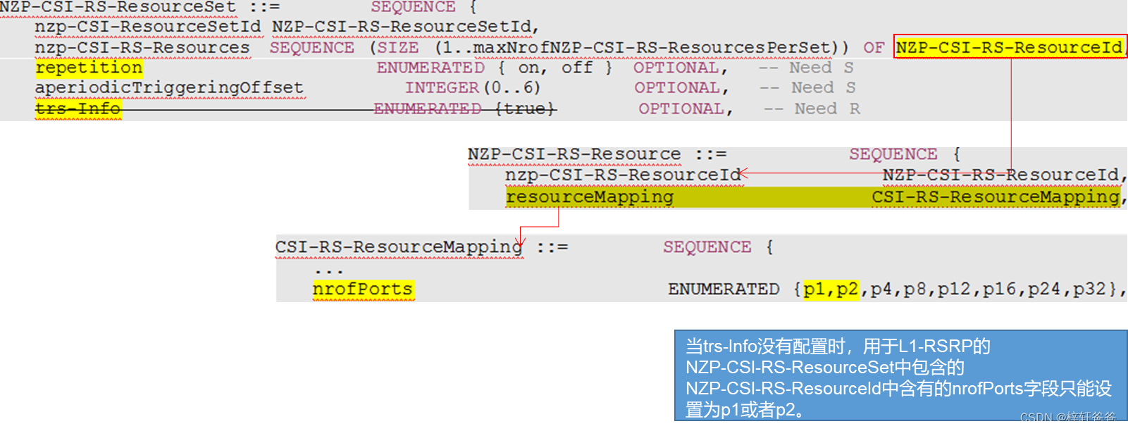 - 对于一个特定的UE而言,不能在NZP-CSI-RS-ResourceSet同时配置IE:trs-Info和repetition(这两个字段都是OPTIONAL的)。