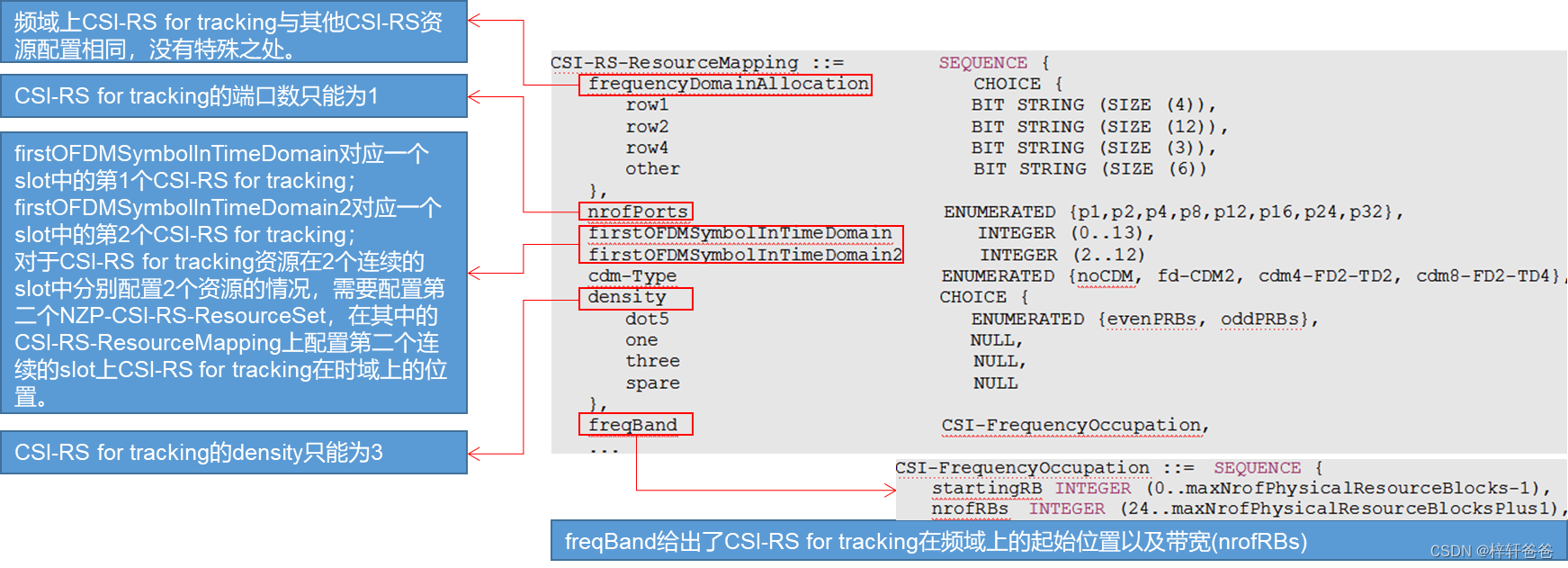 CSI-RS for tracking必须配置为NZP CSI-RS,并且信令NZP-CSI-RS-ResourceSet中IE:trs-Info必须设置为‘true’(该字段trs-Info的意思就是‘Tracking RS Info’),CSI-RS for tracking的资源配置如下: