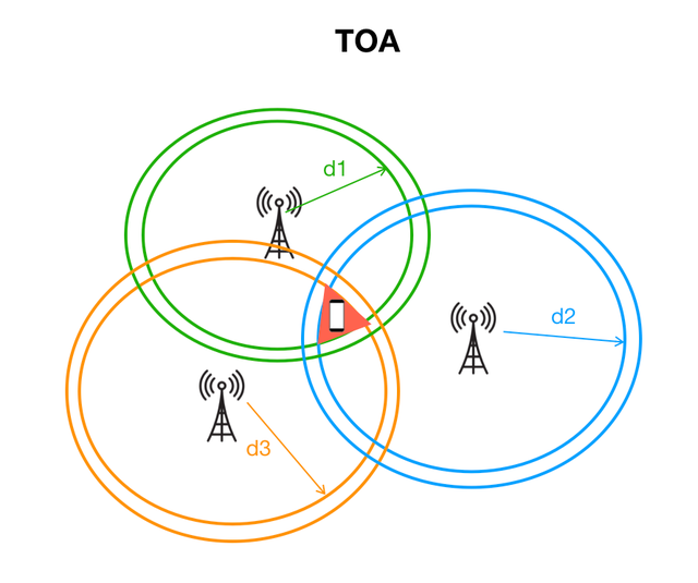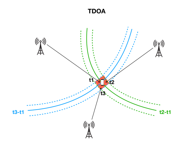 指通过测量多个基站发送的参考信号到达手机的时间,来计算不同基站与手机之间的距离,并以该距离为半径分别画一个同心圆,再通过定位算法(三边定位算法、最小二乘算法),来估算手机位置。