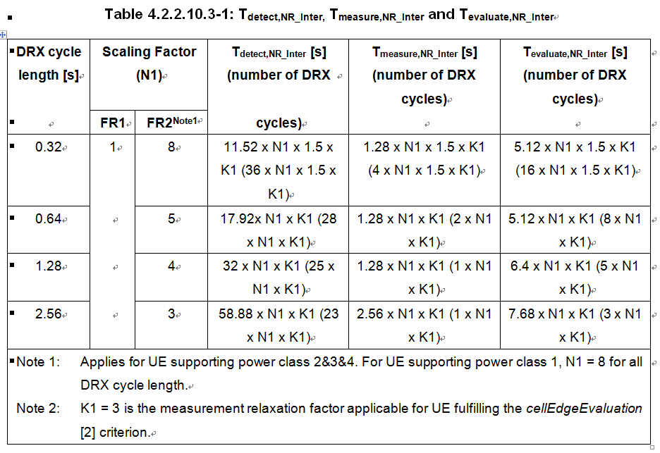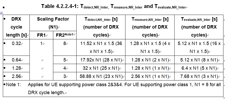 当Srxlev ≤ SnonIntraSearchP or Squal ≤ SnonIntraSearchQ,对于高优先级、相同优先级或低优先级异频,测量所用Tdetect,NR_Inter 、Tmeasure,NR_Inter 、Tevaluate,NR_Inter见下表,其中K1 = 3为非小区边缘场景轻松测量因子。