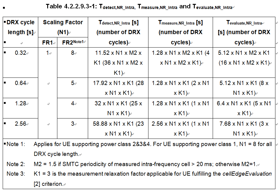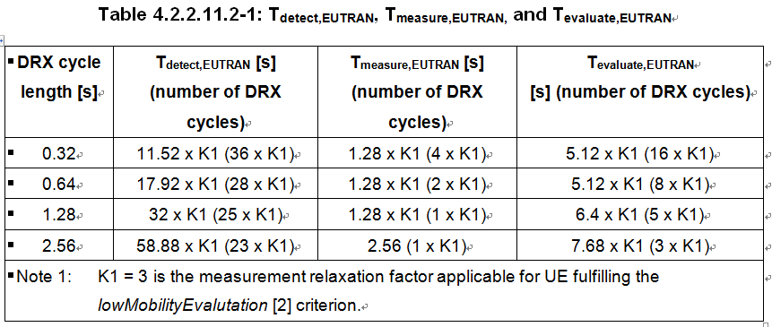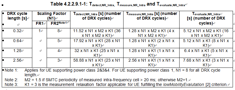 当Srxlev ≤ SnonIntraSearchP or Squal ≤ SnonIntraSearchQ,对于高优先级、相同优先级或低优先级异系统频点,测量所用Tdetect,EUTRAN 、Tmeasure,EUTRAN 、Tevaluate,EUTRAN见下表,其中K1 = 3为非小区边缘场景轻松测量因子。
