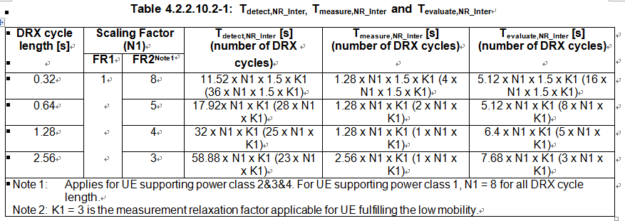 当Srxlev ≤ SnonIntraSearchP or Squal ≤ SnonIntraSearchQ,对于高优先级、相同优先级或低优先级异频,测量所用Tdetect,NR_Inter 、Tmeasure,NR_Inter 、Tevaluate,NR_Inter见下表,其中K1 = 3为低速场景轻松测量因子。
