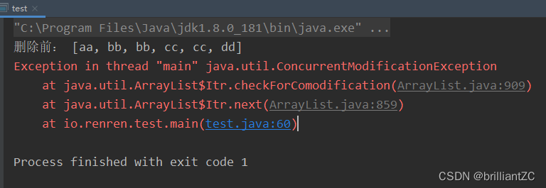 由于执行System.arraycopy方法,导致删除元素时涉及到数组元素的移动。在遍历第二个元素字符串cc时因为符合删除条件,所以将该元素从数组中删除,之后的整个数组就和集体往前移动,此次循环结束后的累加器又 +1,所有相邻的一个就会被忽略掉。