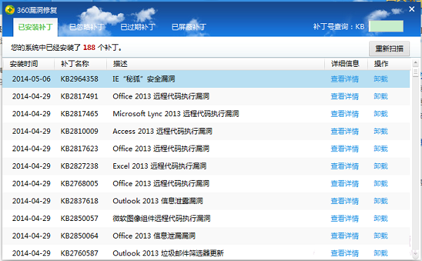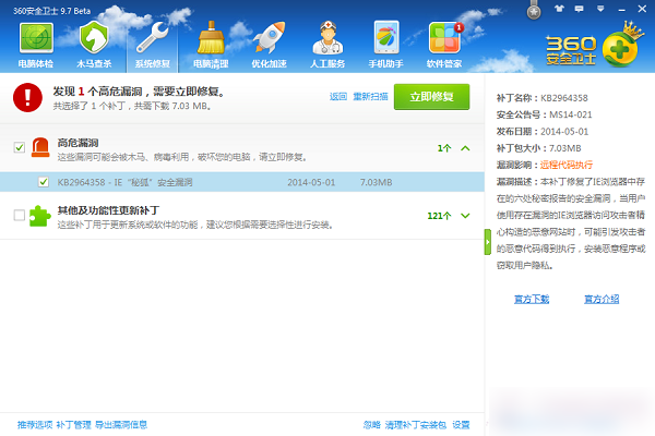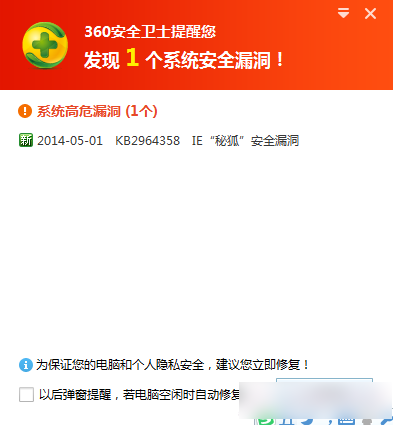 微软5月1日发布了一个IE高危漏洞,KB2964358,很快360就提示你修复安全漏洞,如是点击修复。