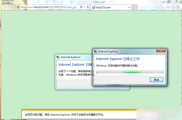 修复安装完成重启后,打开网页发现IE一起提示“Internet Explorer已停止工作。见下图: