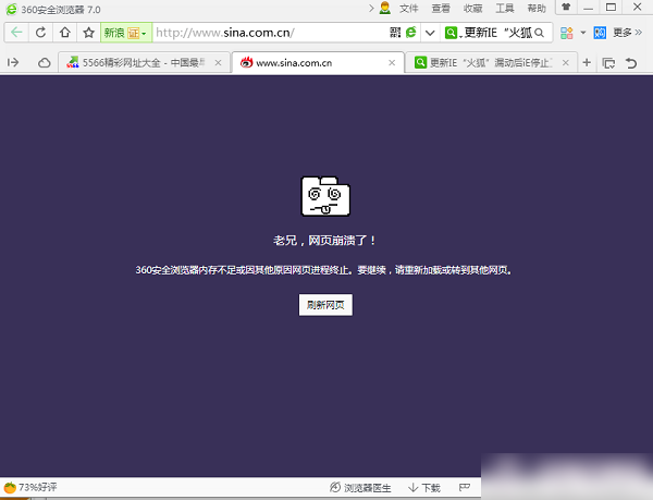 再打开360安全浏览器兼容模式下也不能正常使用提示网页崩溃。见下图: