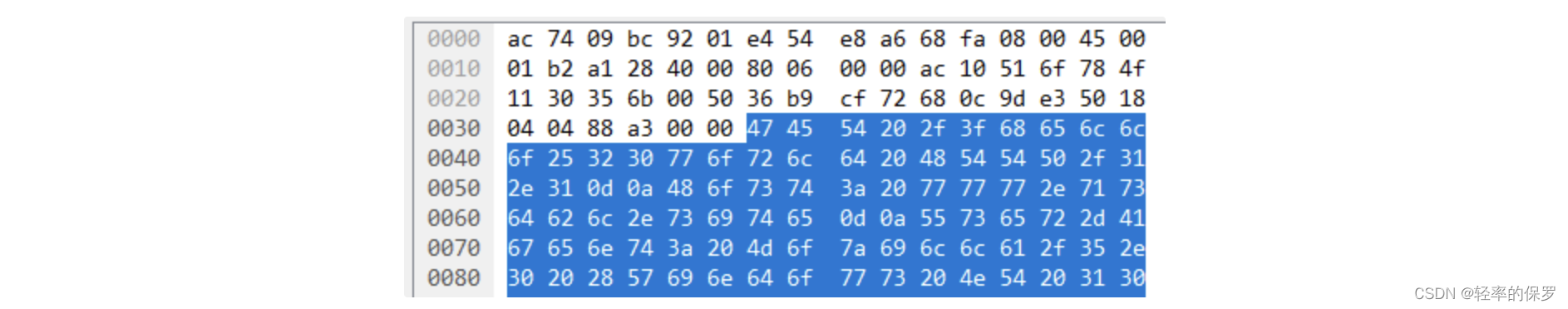 47 45 54 ,转换为二进制数为:0100 0111 0100 0101 0101 0100 。对应ASCII表中的字符为:G E T 。看来这是一个请求报文而且是get请求。