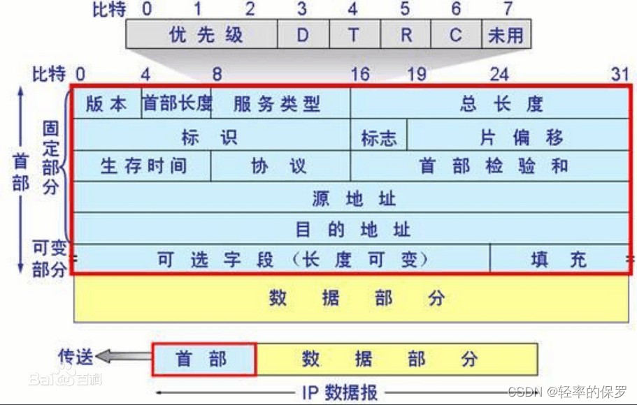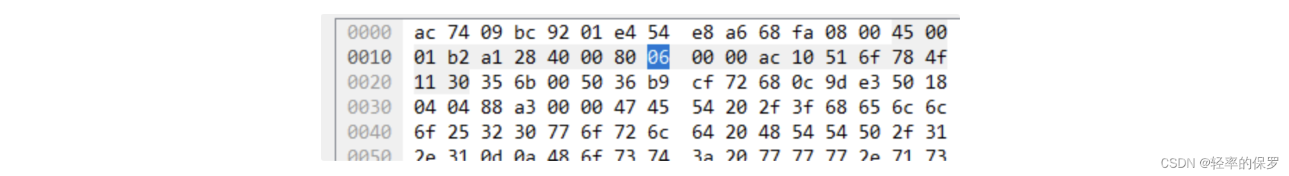 IP数据报头部的第十个字节为上层协议号,抓到的包中,该字段为06即TCP协议。(TCP协议号为6)