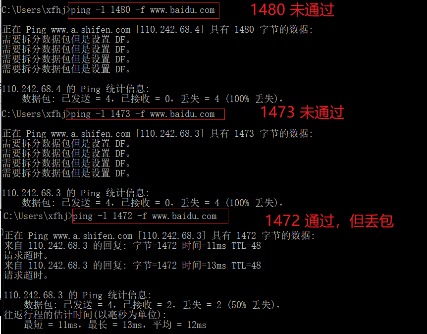 这条命令的意思是向 www.baidu.com(百度主页)发送一个探测请求,请求将一个不允许分割的 1480 字节的数据包发送出去。
